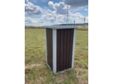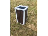 The waste bin is made from recycled plastic. The structure is fixed in a concrete bed. The trash can insert is made of galvanized steel. All other metallic elements are also zinc coated or duplex powder coated with coat curing according to RAL to prevent corrosion. All fastening material is galvanized or stainless steel.