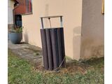 The bin is made from recycled plastic. The structure is fixed in a concrete bed. The trash can insert is made of galvanized steel. All other metallic elements are also zinc coated or duplex powder coated with coat curing according to RAL to prevent corrosion. All fastening material is galvanized or stainless steel.