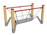 The chain bridge support structure is made from thick glued wooden supports. This solution ensures maximum protection against cracking, which is common for products made from solid wood. The wooden supports are impregnated and coated with a triple layer of lacquer, which meets the terms and conditions of the EN71/3 Standard (safe for children's toys). The structures are anchored into the ground in steel plates, which are protected against corrosion by hot-dip galvanizing and fixed in a concrete bed. The anchors are fastened to the play unit with bolts and their structure ensures that they are not in direct contact with the ground. All other metallic elements are also zinc coated or duplex powder coated with coat curing according to RAL to prevent corrosion. The wobbly beam is hung on a metal support using galvanized chains. All fastening material is galvanized or stainless steel.