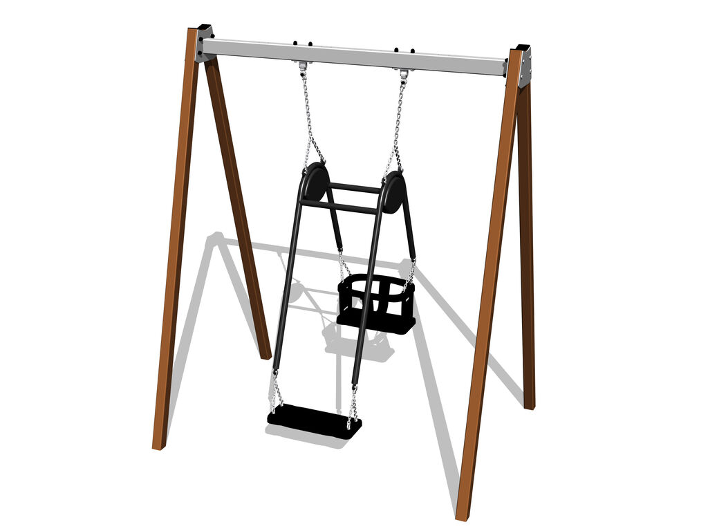 The support structure of the swing is made from structural steel, which is zinc coated or duplex powder coated with coat curing according to RAL to prevent corrosion and is fixed in a concrete bed. The Normal seat is made of aluminum, covered with a soft and comfortable rubber.