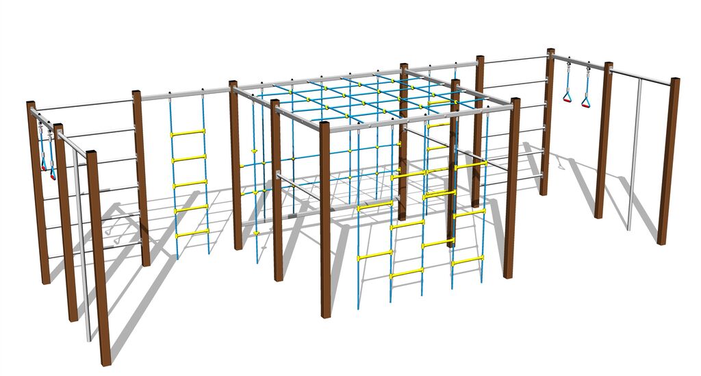 The climbing net, the horizontal climbing net, the climbing rope and the rope ladder are made using HERKULES material (16 mm thick ropes made from polypropylene with a steel internal core) and they are connected with plastic joints. The ropes are connected with plastic joints. All fastening material is galvanized or stainless steel.