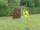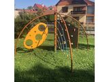 The ropes and nets are made using HERKULES material (16 mm thick ropes made from polypropylene with a steel internal core) and they are connected with plastic joints. The climbing wall is made from HPL (High-preSS88ure laminate, which is characterised by high colour stability, UV resistance and water resistance). The climbing holds are made from the mix of silica sand and epoxy resin, which ensures long life, colour preservation as well as skin friendly surface. The wall is made from high quality HDPE plastic (high density coloured polyethylene, which is characterised by high colour stability, UV resistance but mainly safety as it doesn't break and therefore there is no danger of injury to children by sharp fragments). All fastening material is galvanized or stainleSS88 steel.