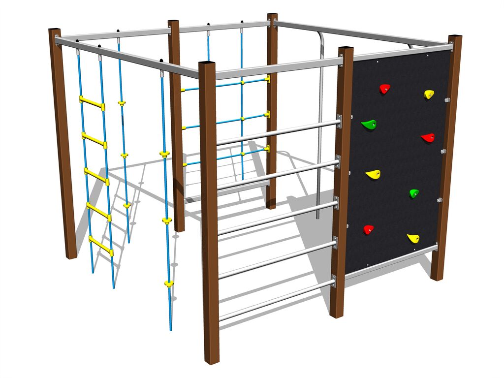 Climbing wall, Swedish ladder, 2x climbing rope, 2x climbing pole, climbing net, rope ladder. More information