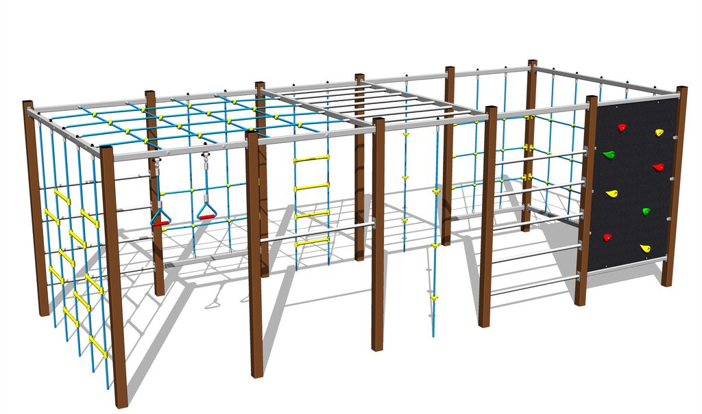 The climbing net, the horizontal climbing net, the climbing rope and the rope ladder are made using HERKULES material (16 mm thick ropes made from polypropylene with a steel internal core) and they are connected with plastic joints. The climbing wall is made from HPL (High-pressure laminate, which is characterised by high colour stability, UV resistance and water resistance). The climbing holds are made from the polyester, which ensures long life, colour preservation as well as skin friendly surface. All fastening material is galvanized or stainless steel.