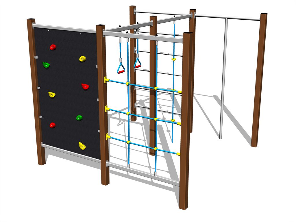 The climbing net, the horizontal climbing net, the climbing rope and the rope ladder are made using HERKULES material (16 mm thick ropes made from polypropylene with a steel internal core) and they are connected with plastic joints. The climbing wall is made from HPL (High-pressure laminate, which is characterised by high colour stability, UV resistance and water resistance). The climbing holds are made from the polyester, which ensures long life, colour preservation as well as skin friendly surface. All fastening material is galvanized or stainless steel.