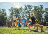 The seesaw beam is made from structural steel, which is zinc coated or duplex powder coated with coat curing according to RAL to prevent corrosion and is anchored to the support structure by carriage bolts. The support structure of the see-saw is steel; it is protected against corrosion by hot-dip galvanizing and fixed in a concrete bed.