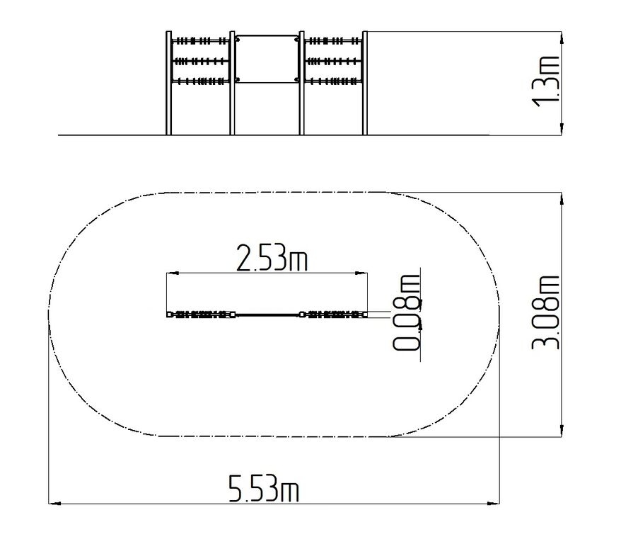 The support structure of the drawing board is made of structural steel which is protected against corrosion by zinc coating, resulting in a very prolonged service life of the workout elements or duplex powder coated with coat curing according to RAL to prevent corrosion. These structures are anchored to concrete footings. All other metallic elements are also zinc coated or duplex powder coated with coat curing according to RAL to prevent corrosion.