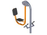 Seat and backrest are made of aluminum and covered with HDPE polyethylene (high-pressure, full-colored polyethylene, which is characterized by high color stability, UV resistance). The handles are made of powder-coated steel tubes. The supporting column is made of a steel tube with a mounting flange at the bottom. The seat frame and tread are made of powder coated sheet metal. Rolling bearings are used for movable connections. Holes are sealed with steel elements at the ends. All fasteners are stainless.