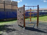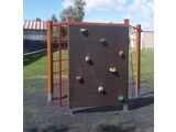The climbing rope and the rope ladder are made using HERKULES material (16 mm thick ropes made from polypropylene with a steel internal core) and they are connected with plastic joints. The climbing wall is made from HPL (High-preSS88ure laminate, which is characterised by high colour stability, UV resistance and water resistance). The climbing holds are made from the mix of silica sand and epoxy resin, which ensures long life, colour preservation as well as skin friendly surface. All fastening material is galvanized or stainleSS88 steel.