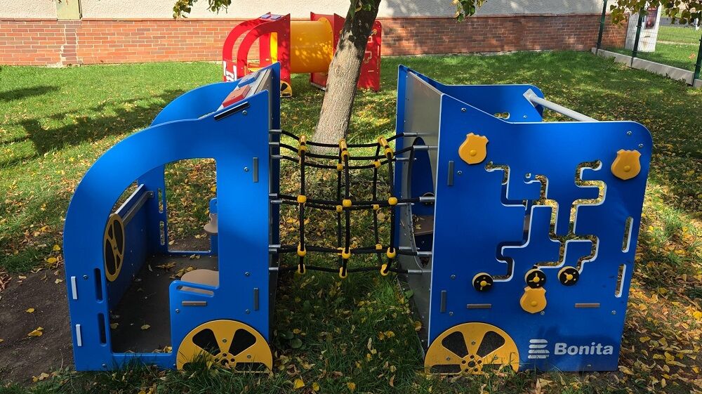 All other parts are made of high quality plastic HDPE (high-pressure, full-color polyethylene, which is characterized by high color fastness, UV resistance and mainly safety, because it is non-breakable and there is no risk of injury to children sharp fragments). Rope tunnel is made using HERKULES material (16 mm thick ropes made from polypropylene with a steel internal core) and are connected with plastic or aluminium joints. All fasteners are galvanized or stainless steel.