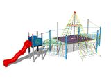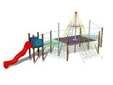 The support structures of the rope unit are made from structural steel with a diameter of 108 mm (support pillar with a diameter of 159 mm), they are zinc coated or duplex powder coated with coat curing according to RAL to prevent corrosion and fixed in a concrete bed. The tower support structures are made from structural steel. The ropes are made using HERKULES material (16 mm thick ropes made from polypropylene with a steel internal core) and are connected with plastic joints. The slide is made from fibreglass. The surface on the slide is made from high quality HDPE plastic (high density coloured polyethylene, which is characterised by high colour stability, UV resistance but mainly safety as it doesn't break and therefore there is no danger of injury to children by sharp fragments). The platform is made from water-proof plywood or from HDPE should the client require. All fastening material is galvanized or stainless steel.