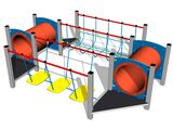 Ropes and nets are made of HERKULES (16 mm polypropylene ropes with inner steel core) and are connected by plastic connectors. The crawler tunnel is made of polyethylene with high UV stability and high colour stability. All step boards are made of high quality HDPE (high-pressure, full-coloured polyethylene, which is characterised by high colour stability, UV resistance and mainly safety because it is rigid and there is no risk of injury caused by sharp broken fragments). The platforms are made from HPL (High-pressure laminate, which is characterised by high colour stability and water resistance). All connecting material is zinc or stainless steel coated.
