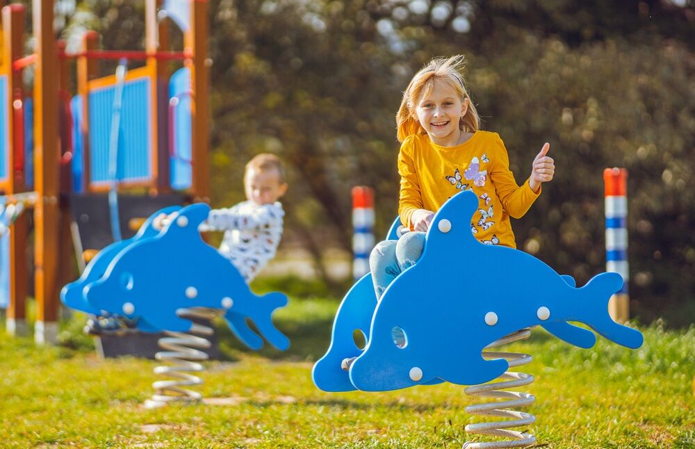 Spring rocker - DOLPHIN. There is no need for a fall zone up to the height of 1 m, a grass surface is enough. More information