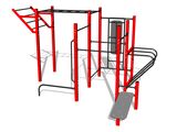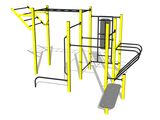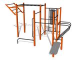 The support structure of the workout set is made of structural steel which is protected against corrosion by zinc coating, resulting in a very prolonged service life of the workout elements or duplex powder coated with coat curing according to RAL to prevent corrosion. All other metallic elements, such as handles, parallel bars etc., are also zinc coated or duplex powder coated with coat curing according to RAL to prevent corrosion or, if required by the customer, the elements can be made in stainless steel.