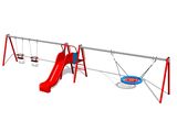 Triple chain swing Nest with slide RH6383K - with a landing and a metal, galvanized boom, drop height 1 m, a lawn is sufficient for the impact surface. 1 seat "nest" (diameter 1 m), 2x Seat Baby. There are four color variations available - red, green, blue and yellow. More information