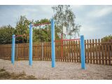 The support structure of the triple fitness rack is made of structural steel which is protected against corrosion by zinc coating, resulting in a very prolonged service life of the workout elements or duplex powder coated with coat curing according to RAL to prevent corrosion and is fixed in a concrete bed. All other metallic elements are also zinc coated or duplex powder coated with coat curing according to RAL to prevent corrosion. The triple fitness rack is constructed with durability and long life in mind. All fastening material is galvanized or stainless steel.