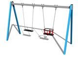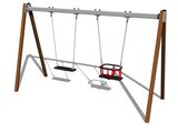 The support structure of the swing is made from structural steel, which is zinc coated or duplex powder coated with coat curing according to RAL to prevent corrosion and is fixed in a concrete bed. The Baby seat is made of rubber and is reinforced with an aluminum insert. The Normal seat is made of aluminum, covered with a soft and comfortable rubber. The chains are stainless steel, resulting in a very prolonged service life of the product. All fastening material is galvanized or stainless steel.