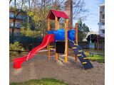 The slide is made from fibreglass. The surfaces of the slides, steps, etc. are made from high quality HDPE plastic (high density coloured polyethylene, which is characterised by high colour stability, UV resistance but mainly safety as it doesn't break and therefore there is no danger of injury to children by sharp fragments). The rope is made using HERKULES material (16 mm thick ropes made from polypropylene with a steel internal core). The platforms and the drawing board are made from HPL (High-pressure laminate, which is characterised by high colour stability and water resistance). The roof is made from HPL (High-pressure laminate, which is characterised by high colour stability, UV resistance and water resistance). All fastening material is galvanized or stainless steel.