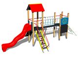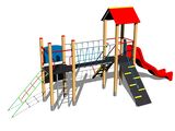 2x tower, A-shaped roof, slide, sloping ramp with the rope and HDPE steps, ladder, sloping ramp with steps and metal handles, bridge with a rope railing, drawing board, barrier. More information
