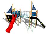 2x tower, slide, metal railing set in a wooden frame, 2x post with a flag, drawing board, sloping net access, sloping ramp with the rope and HDPE steps, anchor, helm made from HDPE, rope bridge, 2x barrier from HDPE. More information