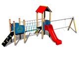 The slide is made from fibreglass. The surfaces of the slides, steps, etc. are made from high quality HDPE plastic (high density coloured polyethylene, which is characterised by high colour stability, UV resistance but mainly safety as it doesn't break and therefore there is no danger of injury to children by sharp fragments). The rope bridge and the rope are made using HERKULES material (16 mm thick ropes made from polypropylene with a steel internal core) and are connected with plastic or aluminium joints. The platforms and the ramp are made from HPL (High-pressure laminate, which is characterised by high colour stability and water resistance). The roof is made from HPL (High-pressure laminate, which is characterised by high colour stability, UV resistance and water resistance). All fastening material is galvanized or stainless steel.