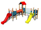 3x tower, 2x slide, A-shaped roof, rope bridge, ladder, 3x barrier from HDPE, crawl tunnel between the towers, sloping net access, sloping ramp with steps and metal handles. More information