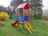The slide is made from fibreglass. The surfaces of the slides, steps, etc. are made from high quality HDPE plastic (high density coloured polyethylene, which is characterised by high colour stability, UV resistance but mainly safety as it doesn't break and therefore there is no danger of injury to children by sharp fragments). The platform is made from HPL (High-pressure laminate, which is characterised by high colour stability and water resistance). The roof is made from HPL (High-pressure laminate, which is characterised by high colour stability, UV resistance and water resistance). All fastening material is galvanized or stainless steel.