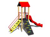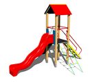 Tower, slide, A-shaped roof, sloping ramp with steps and metal handles, sloping ramp with the rope and HDPE steps, sloping net access. More information