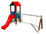 Seats and hinges are not part of the swing. It is necessary to buy a seat (1 pieces) of your choice and curtains (2 pieces). Tower, slide, A-shaped roof, 2x barrier, sloping ramp with steps and metal handles, metal beam. More information