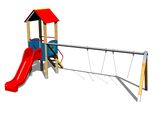 Seats and hinges are not part of the swing. It is necessary to buy a seat (2 pieces) of your choice and curtains (4 pieces). Tower, slide, A-shaped roof, 2x barrier, sloping ramp with steps and metal handles, metal beam. More information