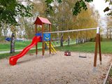 Seats and hinges are not part of the swing. It is necessary to buy a seat (2 pieces) of your choice and curtains (4 pieces). Tower, slide, A-shaped roof, 2x barrier, sloping ramp with steps and metal handles, metal beam. More information