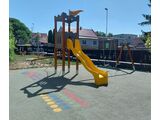 The slide is made from fibreglass. The surfaces of the slide, barriers, flag, etc. are made from high quality HDPE plastic (high density coloured polyethylene, which is characterised by high colour stability, UV resistance but mainly safety as it doesn't break and therefore there is no danger of injury to children by sharp fragments). The climbing net is made using HERKULES material (16 mm thick ropes made from polypropylene with a steel internal core) and are connected with plastic or aluminium joints. The platforms are made from HPL (High-pressure laminate, which is characterised by high colour stability, UV resistance and water resistance). All fastening material is galvanized or stainless steel.