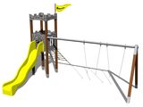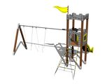 Seats and hinges are not part of the swing. It is necessary to buy a seat (2 pieces) of your choice and curtains (4 pieces). Tower, slide, 2x barrier from HDPE, sloping net access, vertical climbing wall on the tower with steps, flag, battlements from HDPE, metal beam. More information