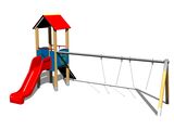 Seats and hinges are not part of the swing. It is necessary to buy a seat (2 pieces) of your choice and curtains (4 pieces). Tower, slide, A-shaped roof, 2x barrier, sloping ramp with the rope and HDPE steps, twin chain swing. More information
