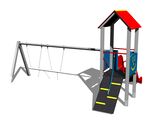 Seats and hinges are not part of the swing. It is necessary to buy a seat (2 pieces) of your choice and curtains (4 pieces). Tower, slide, A-shaped roof, 2x barrier, sloping ramp with the rope and HDPE steps, twin chain swing. More information