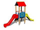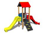Tower, 2x slide, A-shaped roof, sloping ramp with the rope and HDPE steps, barrier. More information