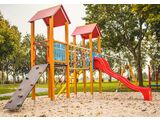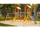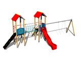 The slide is made from fibreglass. The surfaces of the slides, steps, etc. are made from high quality HDPE plastic (high density coloured polyethylene, which is characterised by high colour stability, UV resistance but mainly safety as it doesn't break and therefore there is no danger of injury to children by sharp fragments). The rope bridge is made using HERKULES material (16 mm thick ropes made from polypropylene with a steel internal core) and is connected with plastic or aluminium joints. The platforms and the sloping climbing wall are made from HPL (High-pressure laminate, which is characterised by high colour stability and water resistance). The climbing holds are made from the mix of silica sand and epoxy resin, which ensures long life, colour preservation as well as skin friendly surface. The roofs are made from HPL (High-pressure laminate, which is characterised by high colour stability, UV resistance and water resistance). All fastening material is galvanized or stainless steel.