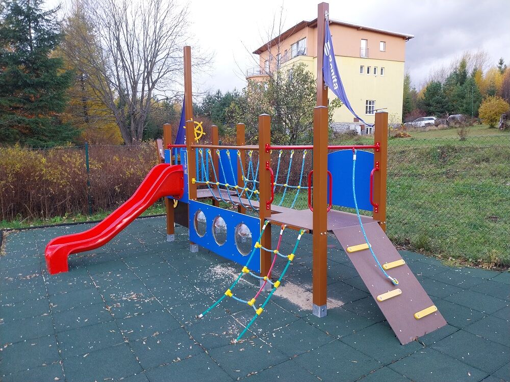 2x tower, slide, metal railing set in a metal frame, 2x post with a flag, drawing board, sloping net access, sloping ramp with the rope and HDPE steps, anchor, helm made from HDPE, bridge with a rope railing, barrier from HDPE, barrier with an apertures, 2x barrier from HDPE. More information