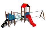The slide is made from fibreglass. The surfaces of the slides, steps, etc. are made from high quality HDPE plastic (high density coloured polyethylene, which is characterised by high colour stability, UV resistance but mainly safety as it doesn't break and therefore there is no danger of injury to children by sharp fragments). The rope bridge and the rope are made using HERKULES material (16 mm thick ropes made from polypropylene with a steel internal core) and are connected with plastic or aluminium joints. The platforms and the ramp are made from HPL (High-pressure laminate, which is characterised by high colour stability and water resistance). The roof is made from HPL (High-pressure laminate, which is characterised by high colour stability, UV resistance and water resistance). All fastening material is galvanized or stainless steel.