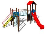 2x tower, slide, A-shaped roof, sloping ramp with the rope and HDPE steps, rope bridge, sloping ramp with steps and metal handles, vertical climbing wall, 2x barrier from HDPE. More information