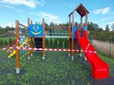 2x tower, slide, A-shaped roof, sloping ramp with the rope and HDPE steps, rope bridge, sloping ramp with steps and metal handles, vertical climbing wall, 2x barrier from HDPE. More information
