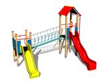 2x tower, 2x slide, A-shaped roof, barrier from HDPE, sloping net access, sloping ramp with the rope and HDPE steps, fire pole, rope bridge. More information