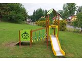 The slide is made from stainless steel. The surfaces of the slides, barriers, etc. are made from high quality HDPE plastic (high density coloured polyethylene, which is characterised by high colour stability, UV resistance but mainly safety as it doesn't break and therefore there is no danger of injury to children by sharp fragments). The rope bridge is made using HERKULES material (16 mm thick ropes made from polypropylene with a steel internal core) and are connected with plastic or aluminium joints. The platform and the ramp are made from HPL (High-pressure laminate, which is characterised by high colour stability, UV resistance and water resistance). All fastening material is galvanized or stainless steel.