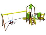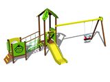2x Tower, slide, roof in the shape of a leaf, sloping ramp with steps and HDPE handles, sloping ramp with HDPE steps, 2x barrier, rope bridge, barrier with an aperture, BABY seat. More information