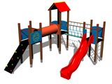 3x tower, slide, A-shaped roof, sloping climbing wall, rope bridge, ladder, 5x barrier from HDPE, crawl tunnel between the towers. More information