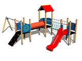 The tower unit support structure is made from thick glued wooden supports. This solution ensures maximum protection against cracking, which is common for products made from solid wood. The wooden supports are impregnated and coated with a triple layer of lacquer, which meets the terms and conditions of the EN71/3 Standard (safe for children's toys). The structures are anchored into the ground in steel plates, which are protected against corrosion by hot-dip galvanizing and fixed in a concrete bed. The anchors are fastened to the play unit with bolts and their structure ensures that they are not in direct contact with the ground. All other metallic elements are also zinc coated or duplex powder coated with coat curing according to RAL to prevent corrosion. The slide is made from fibreglass. The surfaces of the slides, steps, etc. are made from high quality HDPE plastic (high density coloured polyethylene, which is characterised by high colour stability, UV resistance but mainly safety as it doesn't break and therefore there is no danger of injury to children by sharp fragments). The rope bridge is made using HERKULES material (16 mm thick ropes made from polypropylene with a steel internal core) and is connected with plastic or aluminium joints. The platforms and the sloping climbing wall are made from HPL (High-pressure laminate, which is characterised by high colour stability and water resistance). The climbing holds are made from the mix of silica sand and epoxy resin, which ensures long life, colour preservation as well as skin friendly surface. The crawler tunnel is made of fibreglass with high UV stability and high colour stability. The roof is made from HPL (High-pressure laminate, which is characterised by high colour stability, UV resistance and water resistance). All fastening material is galvanized or stainless steel.