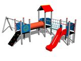 Seats and hinges are not part of the swing. It is necessary to buy a seat (1 pieces) of your choice and curtains (2 pieces). 3x tower, slide, A-shaped roof, sloping climbing wall, rope bridge, ladder, 5x barrier from HDPE, crawl tunnel between the towers, metal beam. More information