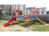 The slides are made from fibreglass. The surfaces of the slides, steps, etc. are made from high quality HDPE plastic (high density coloured polyethylene, which is characterised by high colour stability, UV resistance but mainly safety as it doesn't break and therefore there is no danger of injury to children by sharp fragments). The rope bridges and the rope are made using HERKULES material (16 mm thick ropes made from polypropylene with a steel internal core) and are connected with plastic or aluminium joints. The platforms and the ramp are made from HPL (High-pressure laminate, which is characterised by high colour stability and water resistance). The roofs are made from HPL (High-pressure laminate, which is characterised by high colour stability, UV resistance and water resistance). All fastening material is galvanized or stainless steel.