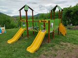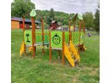 The slide is made from fibreglass. The surfaces of the slides, barriers, etc. are made from high quality HDPE plastic (high density coloured polyethylene, which is characterised by high colour stability, UV resistance but mainly safety as it doesn't break and therefore there is no danger of injury to children by sharp fragments). The rope bridge is made using HERKULES material (16 mm thick ropes made from polypropylene with a steel internal core) and are connected with plastic or aluminium joints. The platform and the ramp are made from HPL (High-pressure laminate, which is characterised by high colour stability, UV resistance and water resistance). All fastening material is galvanized or stainless steel.
