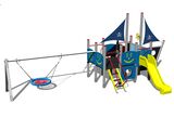 6x tower, 2x slide, 2x metal railing set in a metal frame, 2x post with a flag, sloping net access, helm made from HDPE, 4x barrier from HDPE, 2x barrier with an aperture, sloping ramp with steps and metal handles, drawing board with an anchor, chain swing. More information